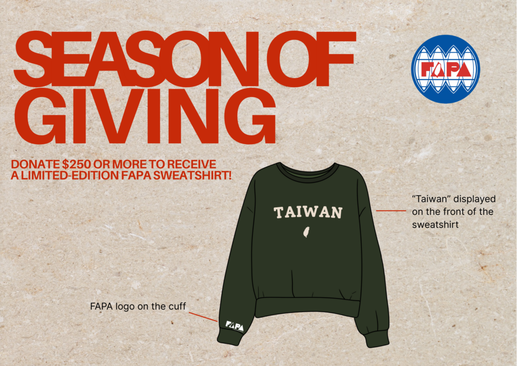 In this Season of Giving, we are offering a limited-edition FAPA sweatshirt as a token of our appreciation for donations of $250 or more. We hope you will wear it proudly as we continue our work to defend Taiwan’s democracy and freedom.