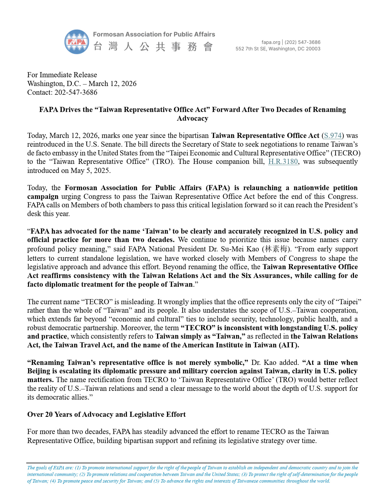 Today, the Formosan Association for Public Affairs (FAPA) is relaunching a nationwide petition campaign urging Congress to pass the Taiwan Representative Office Act before the end of this Congress. FAPA calls on Members of both chambers to pass this critical legislation forward so it can reach the President’s desk this year.