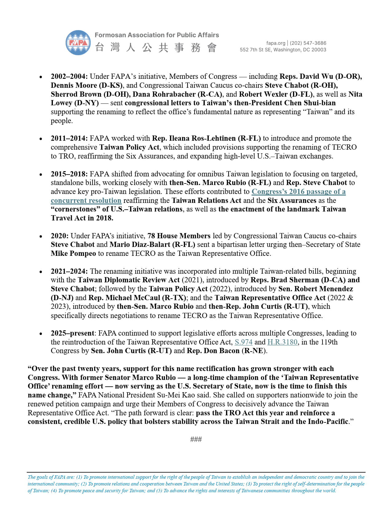 - 2025–present: FAPA continued to support legislative efforts across multiple Congresses, leading to the reintroduction of the Taiwan Representative Office Act, S.974 and H.R.3180, in the 119th Congress by Sen. John Curtis (R-UT) and Rep. Don Bacon (R-NE).