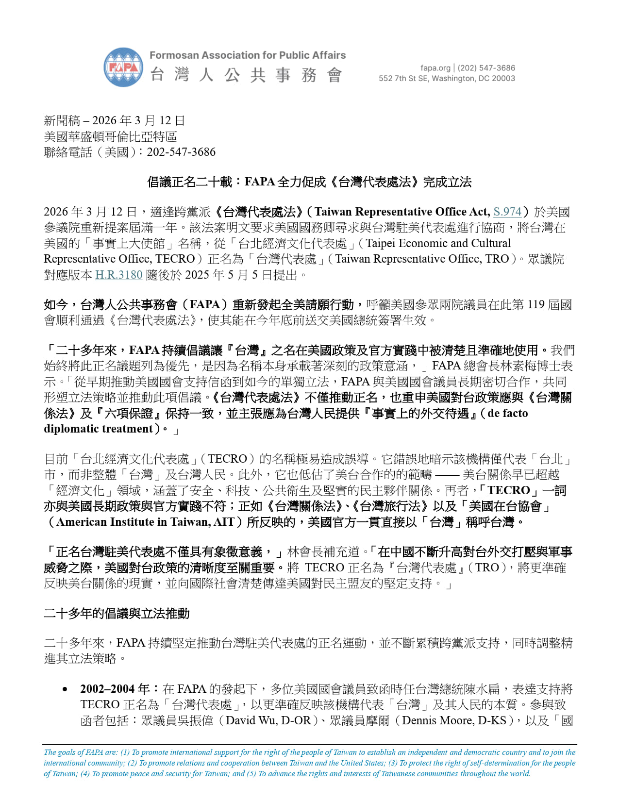 For more than two decades, FAPA has steadily advanced the effort to rename TECRO as the Taiwan Representative Office, building bipartisan support and refining its legislative strategy over time.
