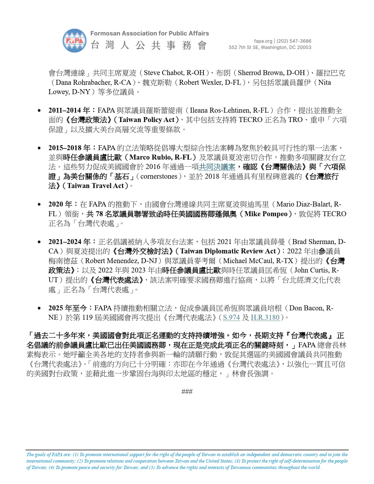 - 2011–2014 年:FAPA 與眾議員羅斯蕾緹南(Ileana Ros-Lehtinen, R-FL)合作,提出並推動全面的《台灣政策法》(Taiwan Policy Act),其中包括支持將 TECRO 正名為 TRO、重申「六項保證」以及擴大美台高層交流等重要條款。
