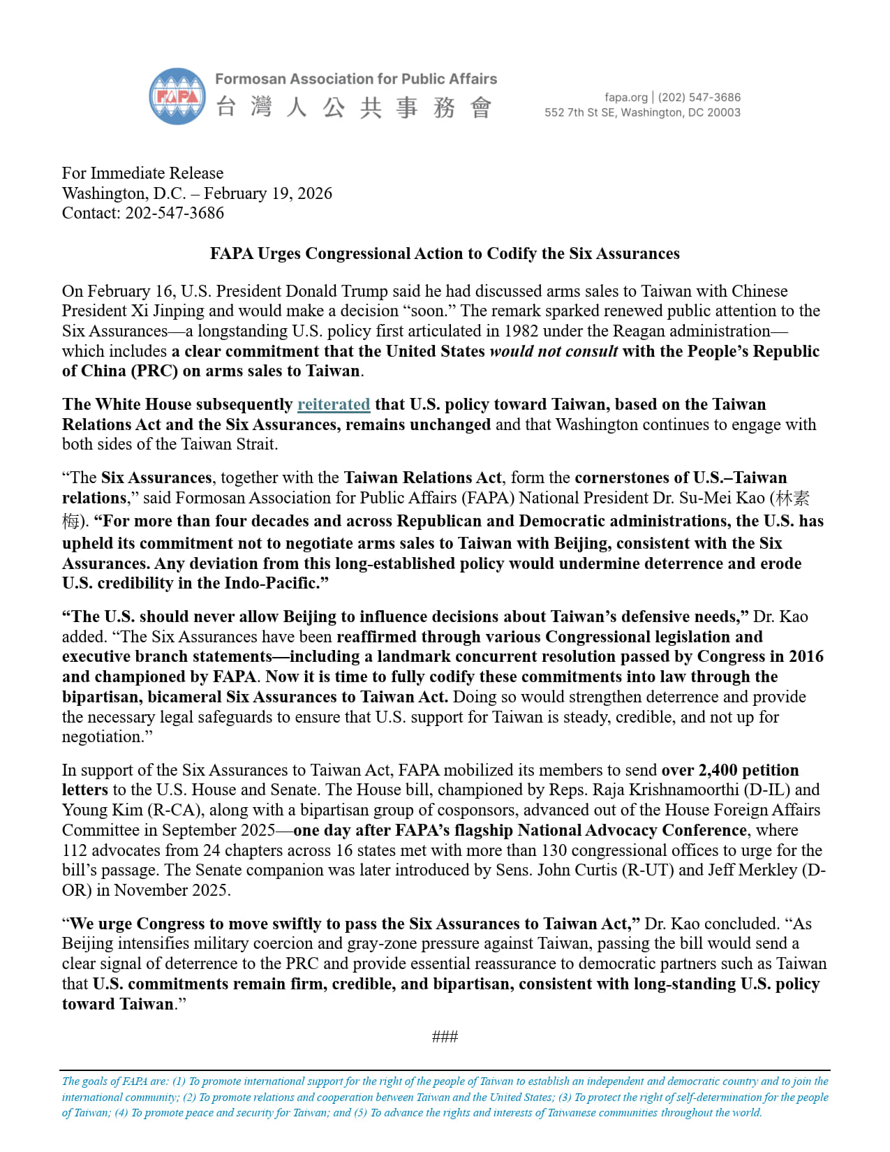 “The Six Assurances, together with the Taiwan Relations Act, form the cornerstones of U.S.–Taiwan relations,” said Formosan Association for Public Affairs (FAPA) National President Dr. Su-Mei Kao (林素梅). “For more than four decades and across Republican and Democratic administrations, the U.S. has upheld its commitment not to negotiate arms sales to Taiwan with Beijing, consistent with the Six Assurances. Any deviation from this long-established policy would undermine deterrence and erode U.S. credibility in the Indo-Pacific.”