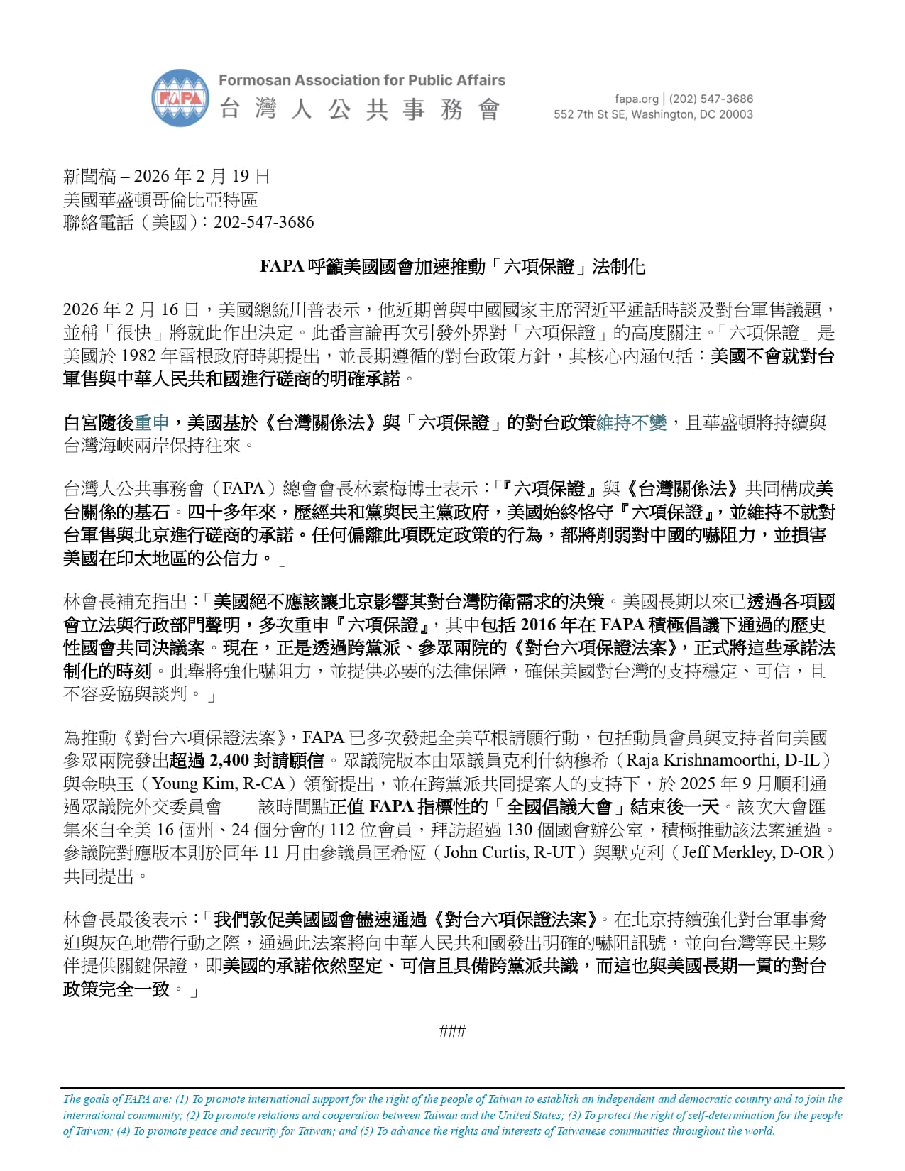 FAPA 呼籲美國國會加速推動「六項保證」法制化