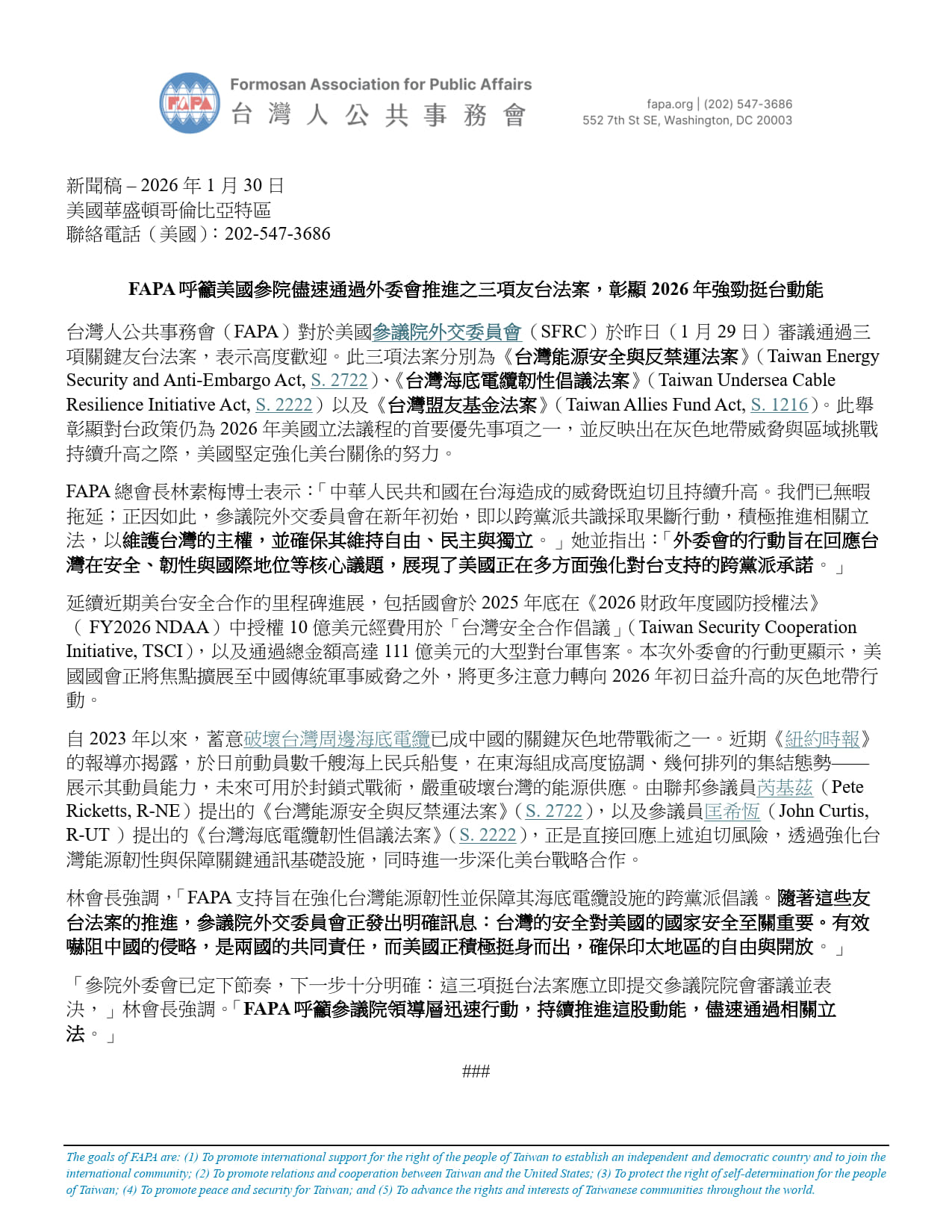台灣人公共事務會(FAPA)對於美國參議院外交委員會(SFRC)於昨日(1 月 29 日)審議通過三項關鍵友台法案,表示高度歡迎。此三項法案分別為《台灣能源安全與反禁運法案》(Taiwan Energy Security and Anti-Embargo Act, S. 2722)、《台灣海底電纜韌性倡議法案》(Taiwan Undersea Cable Resilience Initiative Act, S. 2222)以及《台灣盟友基金法案》(Taiwan Allies Fund Act, S. 1216)。此舉彰顯對台政策仍為 2026 年美國立法議程的首要優先事項之一,並反映出在灰色地帶威脅與區域挑戰持續升高之際,美國堅定強化美台關係的努力。