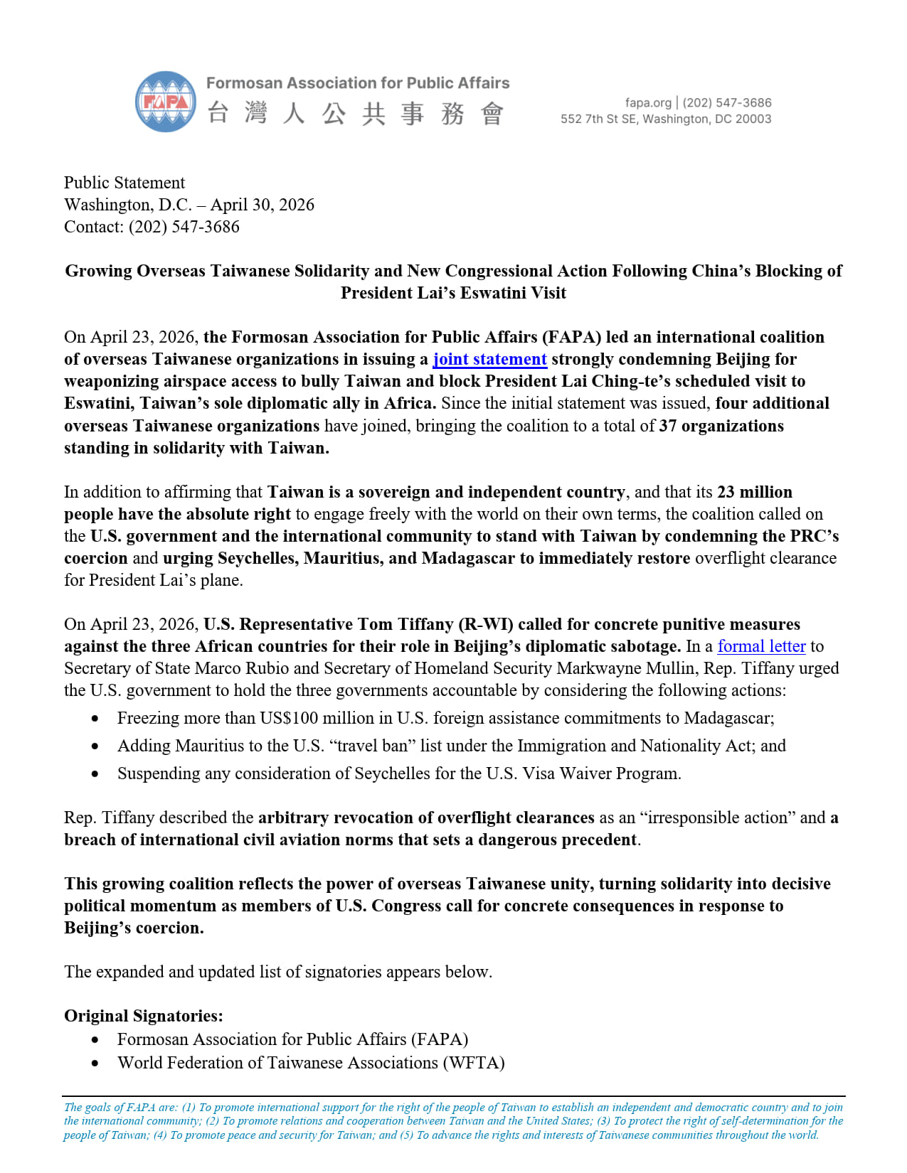 On April 23, 2026, the Formosan Association for Public Affairs (FAPA) led an international coalition of overseas Taiwanese organizations in issuing a joint statement strongly condemning Beijing for weaponizing airspace access to bully Taiwan and block President Lai Ching-te’s scheduled visit to Eswatini, Taiwan’s sole diplomatic ally in Africa. Since the initial statement was issued, four additional overseas Taiwanese organizations have joined, bringing the coalition to a total of 37 organizations standing in solidarity with Taiwan.