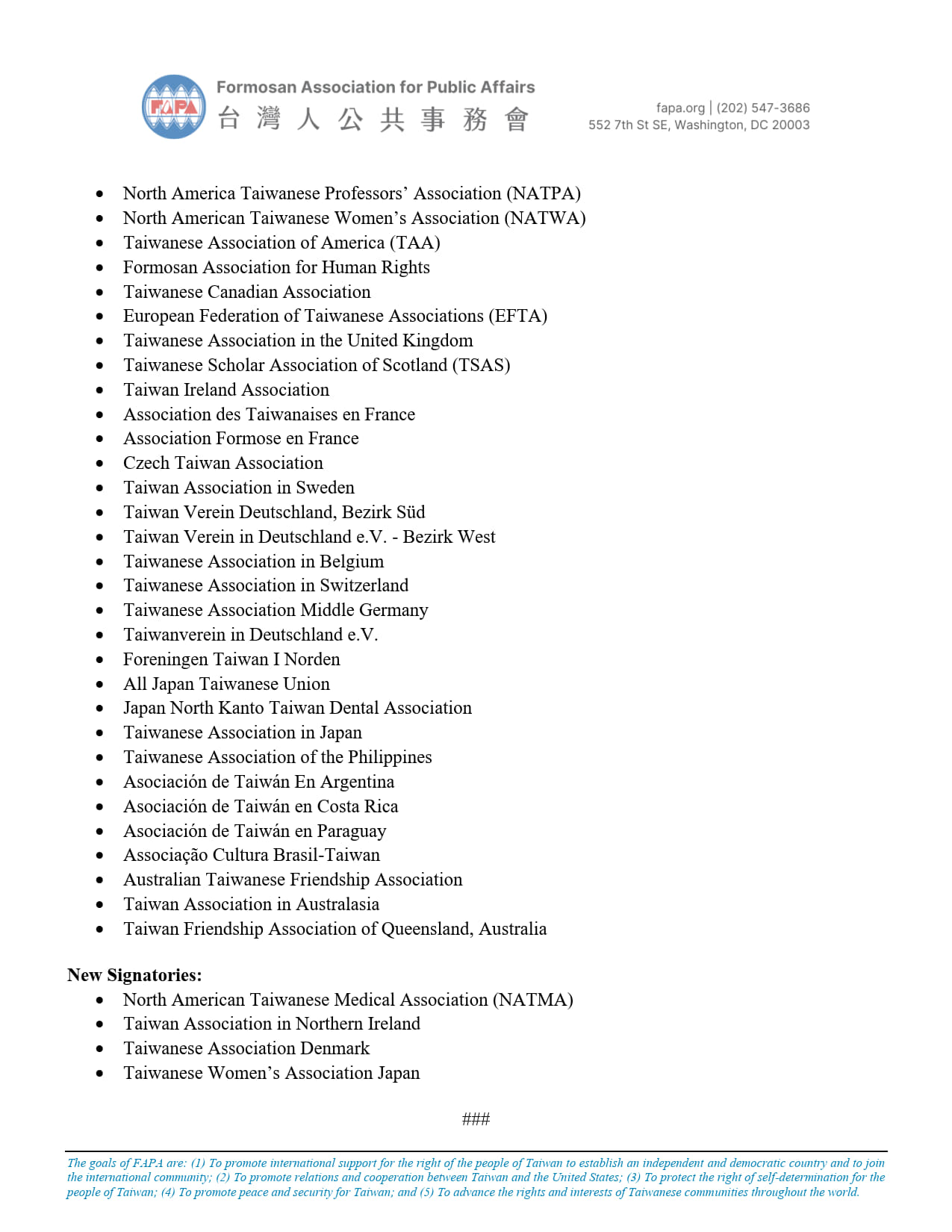 - Formosan Association for Public Affairs (FAPA)