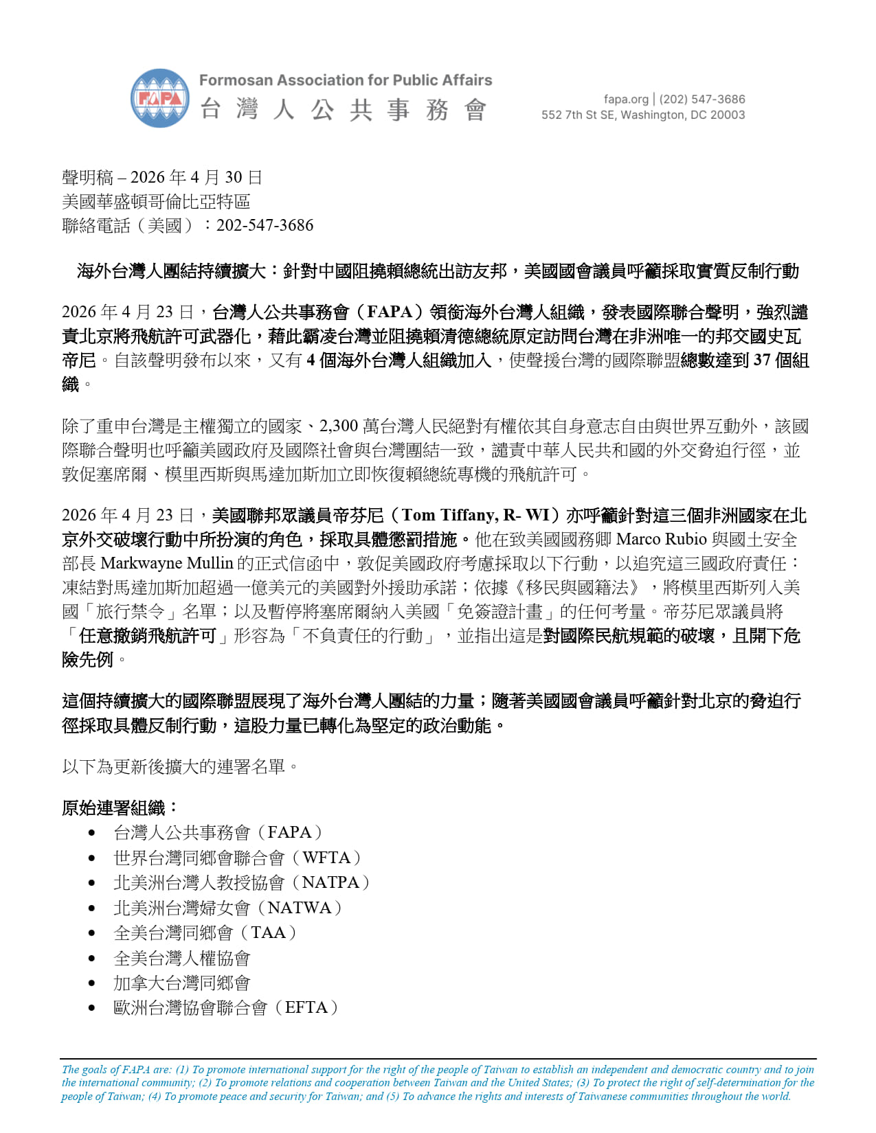 2026 年 4 月 23 日,台灣人公共事務會(FAPA)領銜海外台灣人組織,發表國際聯合聲明,強烈譴責北京將飛航許可武器化,藉此霸凌台灣並阻撓賴清德總統原定訪問台灣在非洲唯一的邦交國史瓦帝尼。自該聲明發布以來,又有 4 個海外台灣人組織加入,使聲援台灣的國際聯盟總數達到 37 個組織。