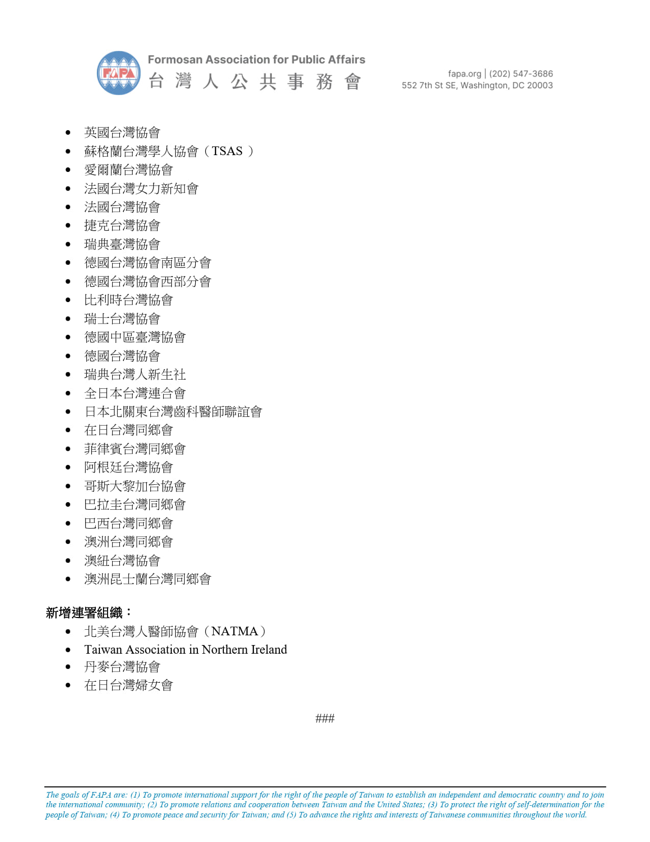 - 台灣人公共事務會(FAPA)